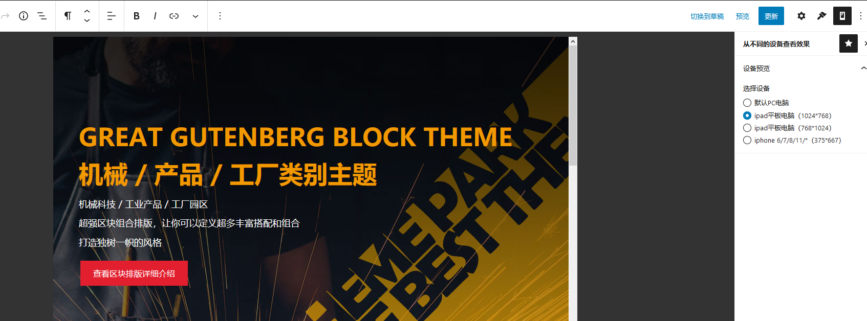 现在不仅仅是在首页,你可以在任意的页面和文章页使用区块进行排版制作你的落地页或者更丰富的产品介绍页,在WEB主题公园的主题中,你甚至可以挂载区块模板在导航、分类列表和小工具上
